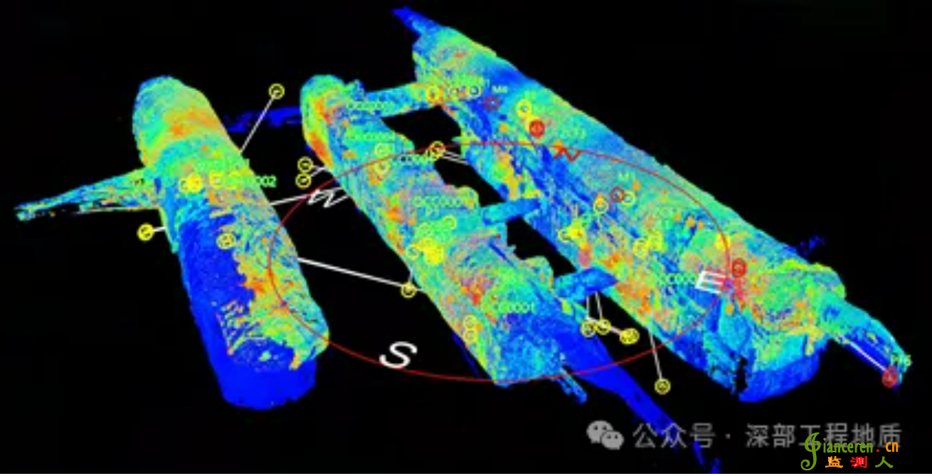 綜合采用多點位移計、光纖、應力計、微震、激光掃描、無人機、鉆孔TV、聲波等多種監測手段,建立全時、全域三維立體監測體系,提出自動化、數字化、智能化感知識別方法,全面獲取圍巖變形、應力、破裂、損傷、結構面等多源監測信息。